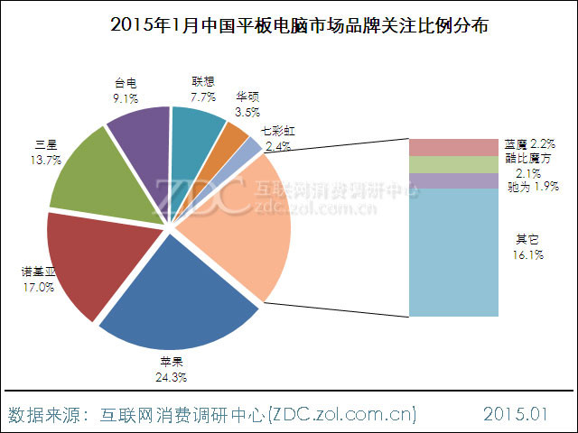 2015年1月中國平板電腦市場上,諾基亞的進駐帶來一系列變化,品牌榜由兩強相爭變?yōu)槿愣αⅲO果、諾基亞與三星累計占據(jù)五成關注份額,其它品牌均在10.0%以下。...