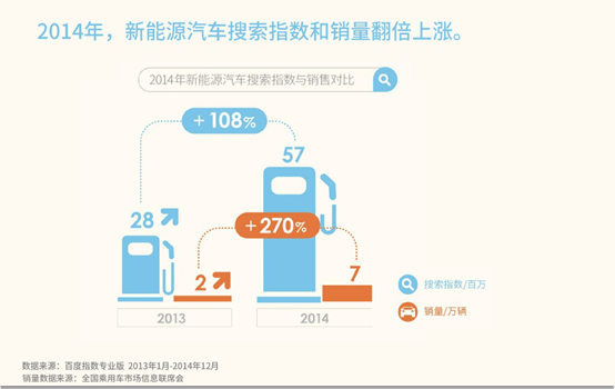 在2014年百度搜索中網民對新能源汽車搜索量增長108%,而國內新能源汽車的銷量也達到270%的增量。該現象表明,在國內環保觀念日益加強、各地良好政策相繼落實的背景下,中國消費對新能源汽車的認可度正在逐漸提升,新能源汽車或將駛入高速通道。...
